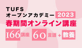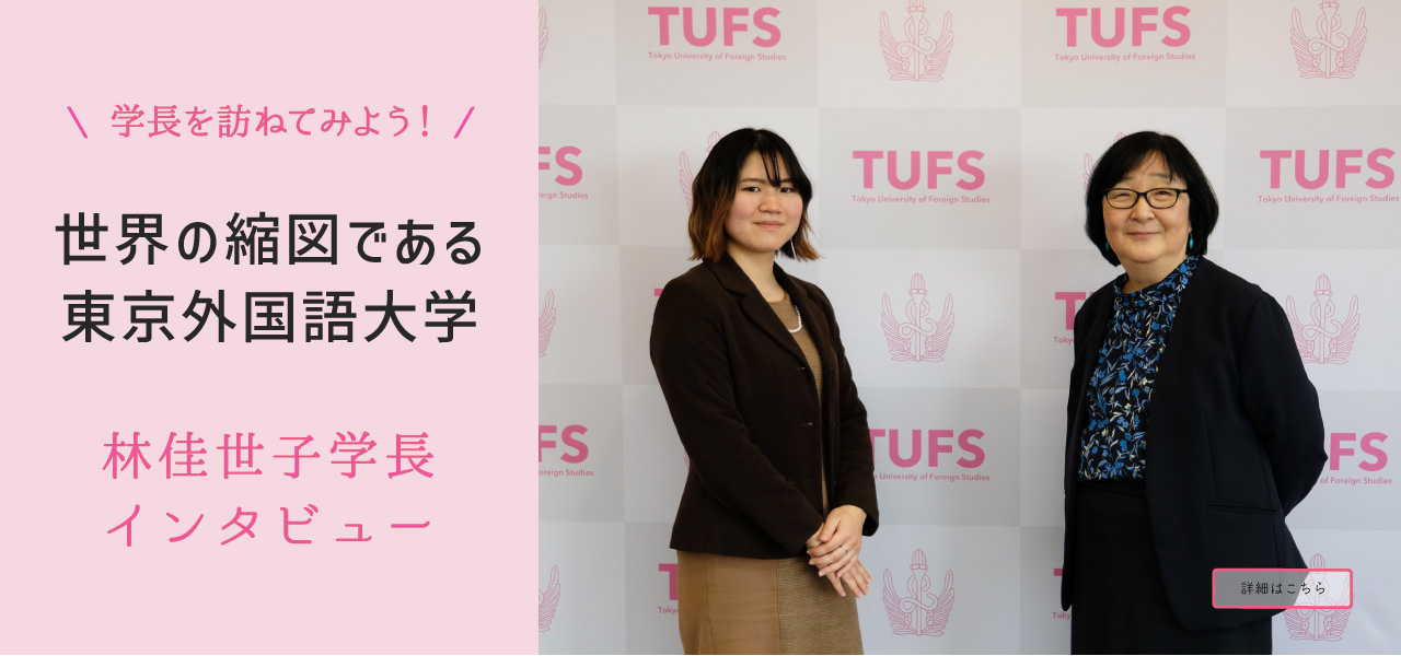 English メインメニュー HOME 大学案内 教育 研究 社会貢献 入試情報 組織 お問い合わせ 交通アクセス サイトマップ 訪問者別 受験生の方へ 在学生の方へ 保護者の方へ 卒業生の方へ 教職員向け(学内限定) 2023.01.04 【重要なお知らせ】⼊学者選抜の実施に伴うキャンパス⽴ち⼊り禁⽌について 2020.02.14 【まとめ】新型コロナウィルスへの対応について SPOTLIGHT --> 2023年度春学期 教務まとめ TUFSオープンアカデミー2023春のラインナップ! ヨルダン日本語教育隊員派遣事業 グラウンド人工芝化プロジェクト pieria(ピエリア)〜東京外大発行の読書冊子〜 ウクライナ情勢関連 TUFS Cinema 上映会情報 東京外大教員の本 学生相談の総合案内 環境・エネルギーへの取組 受験生ナビ Hello! TUFS 本学を目指す受験生向けの情報を掲載中! 寄附のお願い NOTICE 2023.03.02 お知らせ 博士前期課程ダブル・ディグリープログラム「公共圏における歴史」参加大学院生募集(募集要項公開) 2023.03.01 お知らせ TUFS Today特集:「学長インタビュー:世界の縮図である東京外国語大学」を公開しました 2023.02.22 お知らせ 2022年度卒業式・学位記授与式について(2023年2月22更新) 2023.02.22 お知らせ TUFS Today特集:「対談企画 〜教育研究の成果を、共生に向けた諸問題の解決に資する社会連携〜」を公開しました 2023.02.13 お知らせ 地震を受けトルコとシリアの協定校へお見舞いのメッセージを送りました 2023.01.25 お知らせ 【学長メッセージ】秋学期の終わりにあたり、学生の皆さんへ MORE RSS TOPICS 2023.03.09 大学の動き 国立台湾師範大学副学長が本学を訪問 2023.02.27 大学の動き 駐日ネパール大使が林学長を表敬訪問 2023.02.27 大学の動き 文科省委託の高校段階の外国につながる生徒のための日本語能力評価に関する研究・調査の成果報告会を開催 2023.02.22 大学の動き トルクメニスタンの国際人文開発大学長と大使が本学を表敬訪問 2023.02.20 大学の動き シリア「非アラビア語話者のためのアラビア語教育学院」所長による授業開講 MORE RSS EVENTS CALENDAR RSS FOLLOW TUFS 東京外国語大学に行こう 東京外国語大学ってどんなところ?その答えを導きだすために、実際にみて、感じてください。 府中キャンパスは門がなく、誰にでも開かれています。あなたもキャンパスの風を感じてみませんか。 DISCOVER MORE 建学150周年基金 にじいろ〜日本の、その先へ〜 スーパーグローバル大学構想 トビタくん留学日記 大学の世界展開力強化事業 東京外国語大学出版会 日本語で読む世界のメディア 言語モジュール 東京外語会 東京外国語大学生活協同組合 四大学連合 全国外大連合 三大学・文理協働型人材育成 TUFS Todayメルマガ