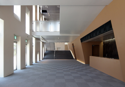 ![]() エントランスホール1(受付カウンター) エントランスホール1にある出入り口をメインとすることで 他の施設から正面に受付を配した独立したホールとして の使用が可能となる。