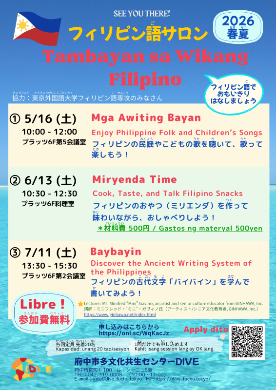 本学フィリピン語専攻が企画・運営に協力する「フィリピン語サロン」が府中市多文化共生センターDIVEにて開催されます。