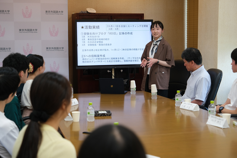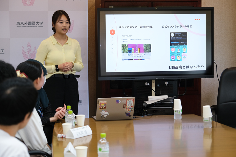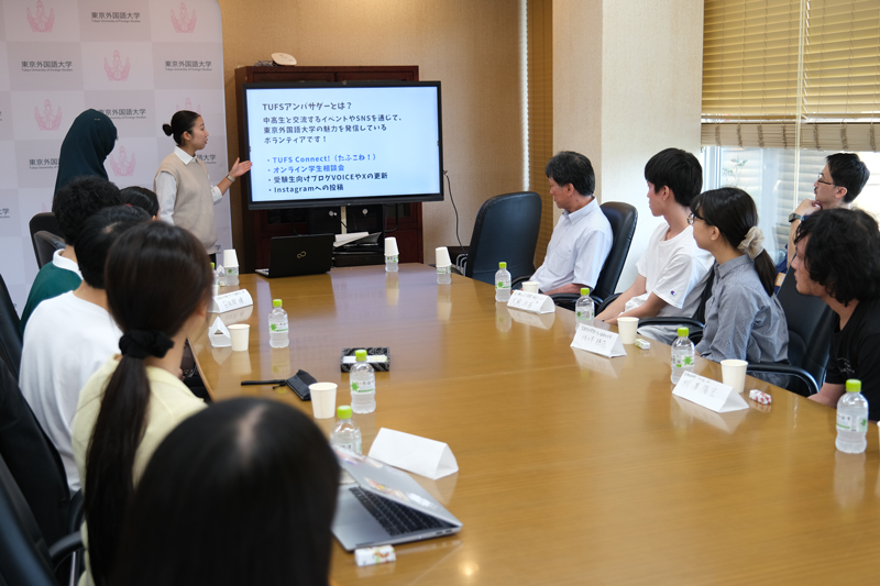 2025年9月25日(木)、学長室にてTUFSアンバサダー(入試広報アンバサダー)と学長との懇談会が開催され、広報活動に主体的に関わる学生たちがこれまでの取り組みを報告し、大学の魅力や課題について意見を交わしました。