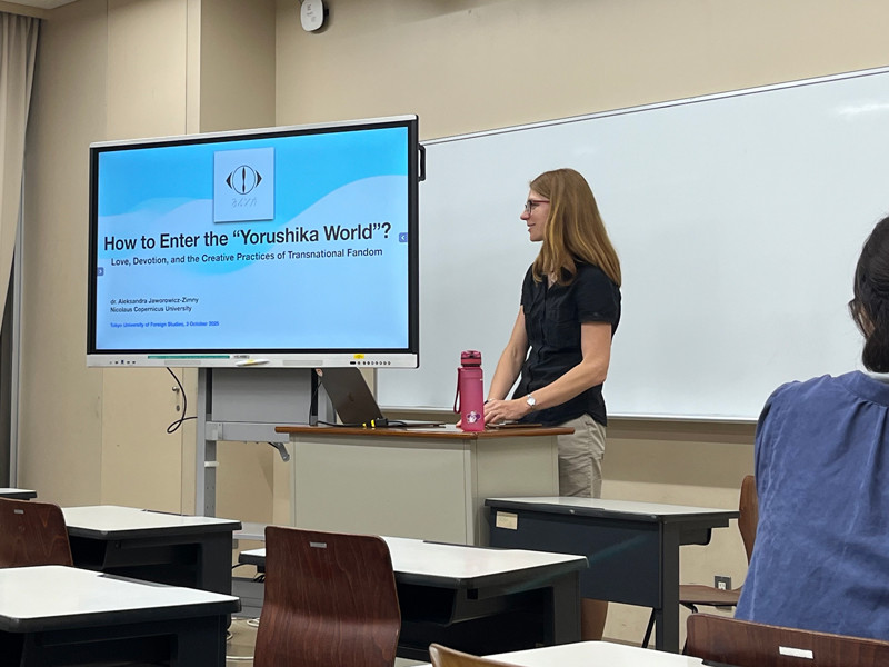 2025年10月3日(金)、国際教育支援室(IES)が設立した「TUFS音楽ファンKAI」による特別講演が開催されました。今回は、ポーランド出身のAleksandra Jaworowicz-Zimny先生(ニコラウス・コペルニクス大学)をゲストとして迎え、“How to Enter the ‘Yorushika World’? Love, Devotion, and the Creative Practices of Transnational Fandom” と題して、日本語で歌うバンド「ヨルシカ」が、どのようにして海外でファンを獲得してきたのか、その背景とファンダムの創造的実践について講演していただきました。(イベント情報はこちら)