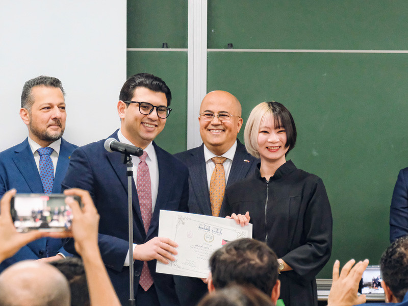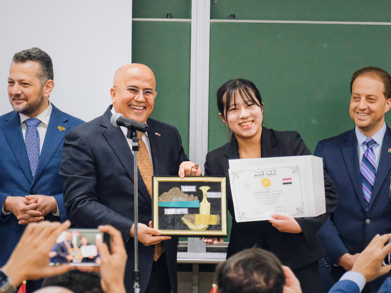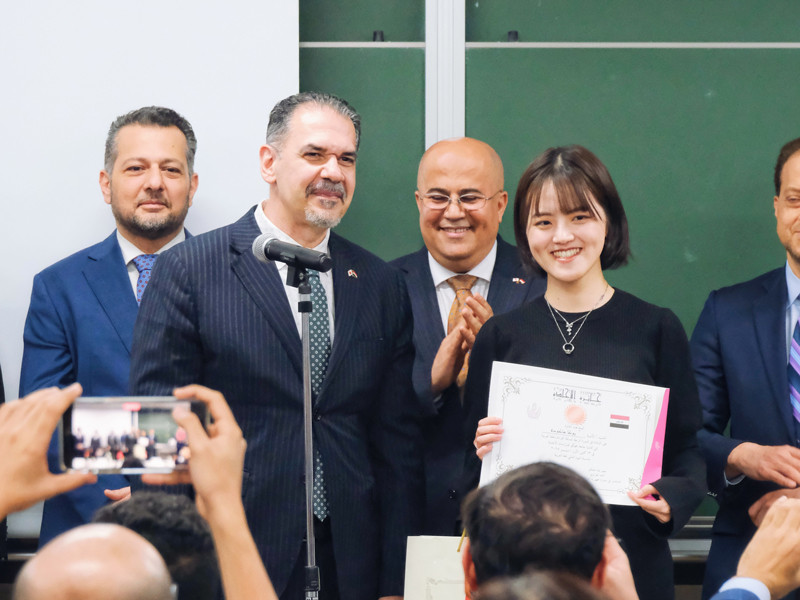 4位 箱田有花さん(早稲田大学文学部中東・イスラーム研究コース)(賞状とイラク大使館からの副賞授与)