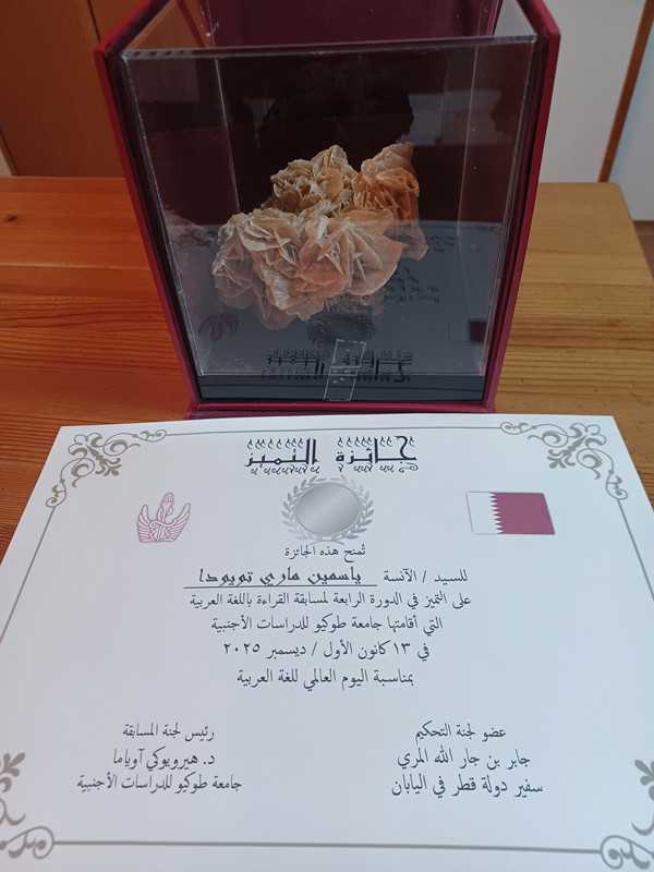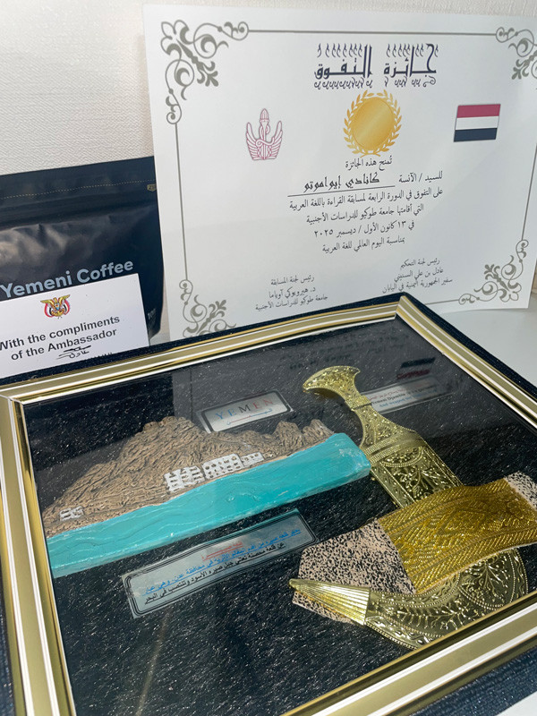 1位 岩本海奏さん(東京外国語大学国際社会学部1年)(賞状とイエメン大使館からの副賞授与)