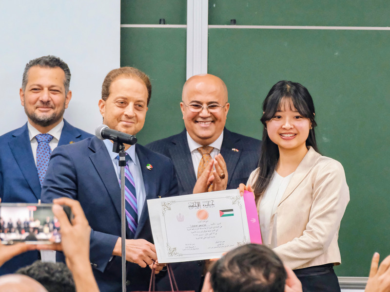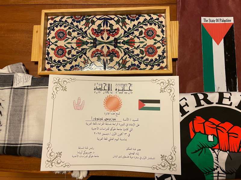 5位 殿浦希さん(東京外国語大学言語文化学部1年)(賞状とパレスチナ代表部からの副賞授与)