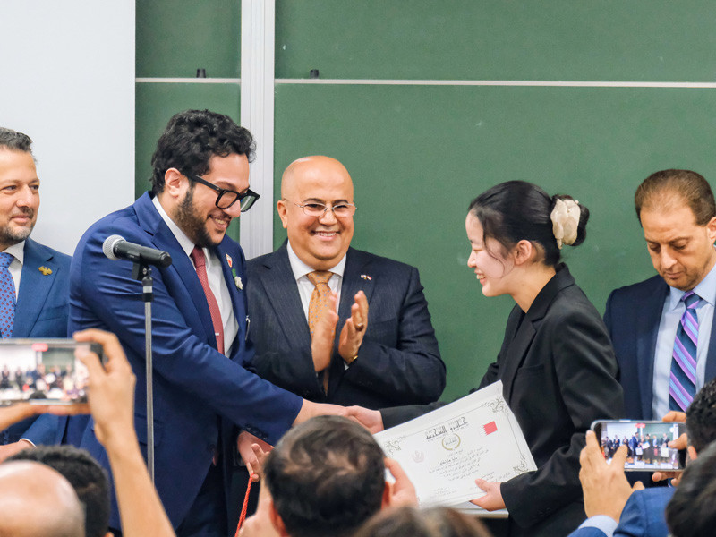 6位 早川咲絢さん(東京外国語大学言語文化学部1年)(賞状とバーレーン大使館からの副賞授与)