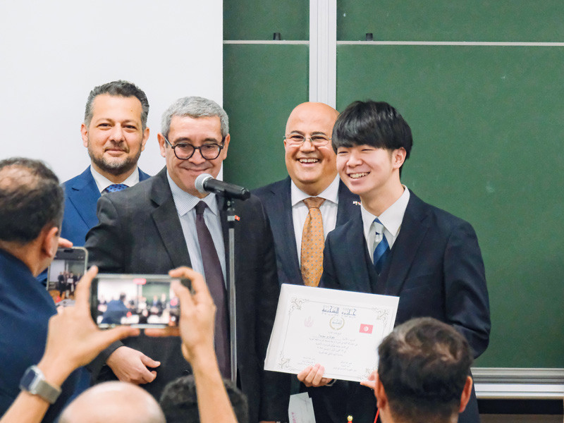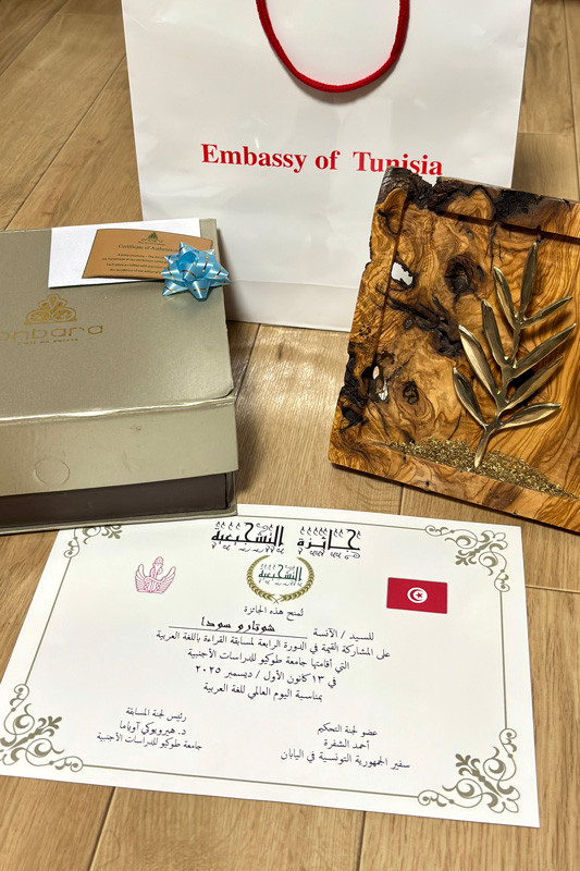 8位 須田秀太朗さん(東京外国語大学言語文化学部1年)(賞状とチュニジア大使館からの副賞授与)