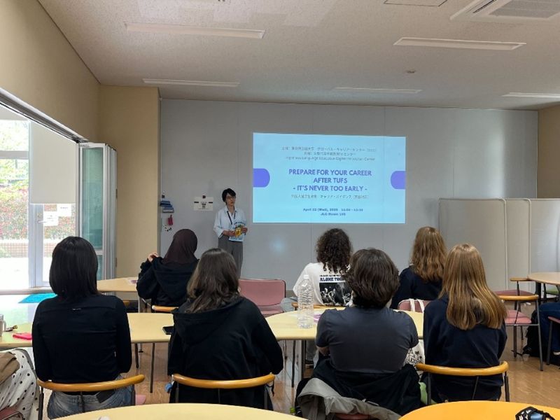 On April 22 (Wed), a career guidance session conducted in English titled “Prepare for your career after TUFS – It’s never too early” was held. The guidance was jointly organized by the Global Career Center and the Japanese Language Education Digital Innovation Center focusing on job hunting and improving Japanese language skills. The guidance also covered the support available both in and out of the university for international students.