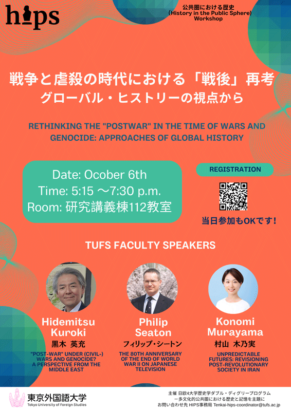ウクライナやガザなど各地で戦争と殺戮が続く今日、平和と秩序を 前提としてきた「戦後」という枠組みは、なお有効な歴史的概念た りうるのか。本ワークショップでは、第二次世界大戦終結から80 年を迎える2025年に、東京外国語大学の教員・ 研究員が専門とする各地の「戦後」のあり方を議論し、「 戦争のあと」の構想力を育む場とすることを目指します。
