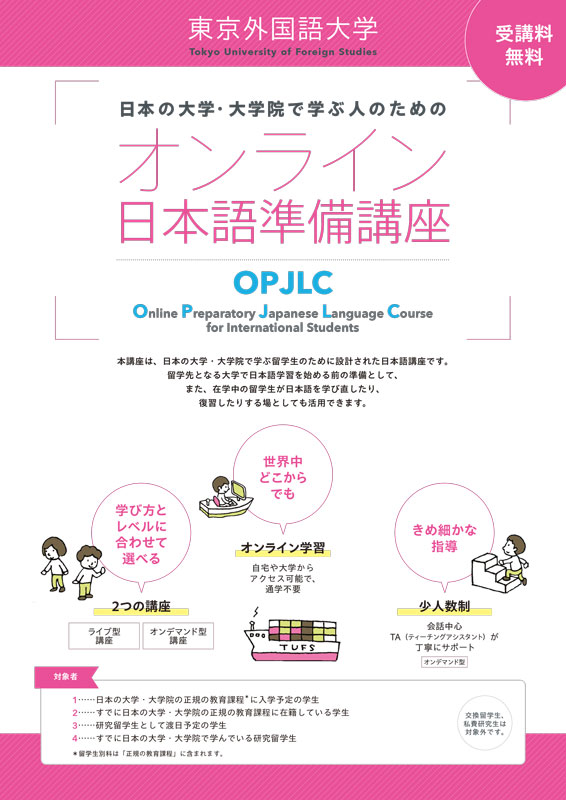 The Tokyo University of Foreign Studies (TUFS) is offering online Japanese language course for international students (undergraduate and graduate) twice a year, in the spring and fall terms. In this course, students can choose between a "Live-Lesson Type" and an "On-Demand Learning Materials & Self-Study Type" according to their level and learning style. Please refer to the "Course Outline" below for more information about the study contents.