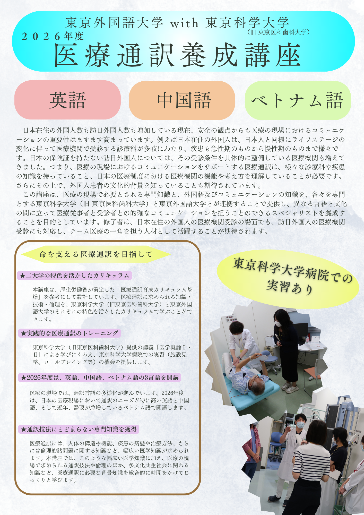この講座は、医療の現場で必要とされる専門知識と、外国語及びコミュニケーションの知識を、各々を専門とする東京科学大学(旧東京医科歯科大学)と東京外国語大学とが連携することで提供し、異なる言語と文化の間に立って医療従事者と受診者との的確なコミュニケーションを担うことのできるスペシャリストを養成することを目的としています。修了者は、日本在住の外国人の医療機関受診の場面でも、訪日外国人の医療機関受診にも対応し、チーム医療の一角を担う人材として活躍することが期待されます。