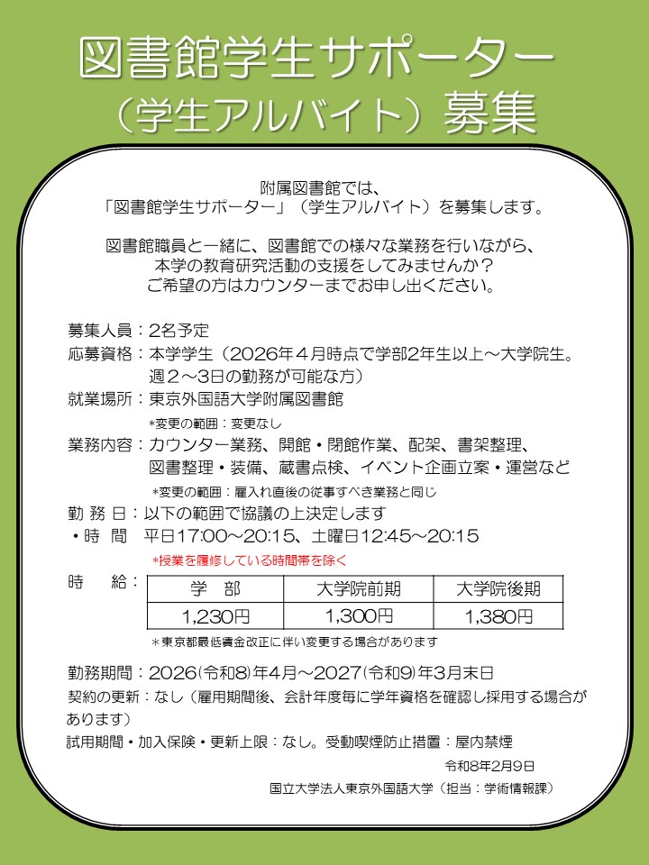 「図書館学生サポーター」(学生アルバイト)募集 2026.02.09 附属図書館では「図書館学生サポーター」(学生アルバイト)を募集します。下記の要項をご覧のうえ、ご希望の方はカウンターまでお申し出ください。