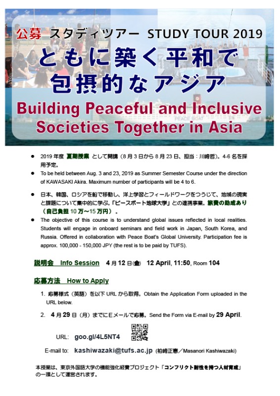 問合せ・応募先: kashiwazaki[at]tufs.ac.jp (柏崎正憲/研究講義棟631)