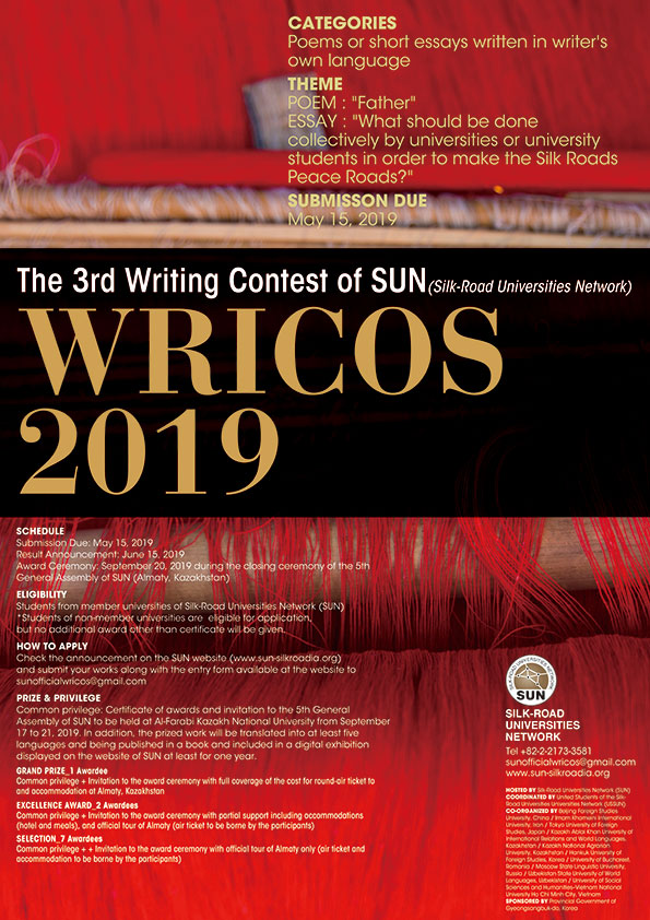 本学が加盟するシルクロード大学ネットワーク(SUN|The Silk-road Universities Network)の第3回WRICOS(ライティングコンテスト)及び第4回PHOCOS (フォトコンテスト)の参加者募集についてご案内いたします。