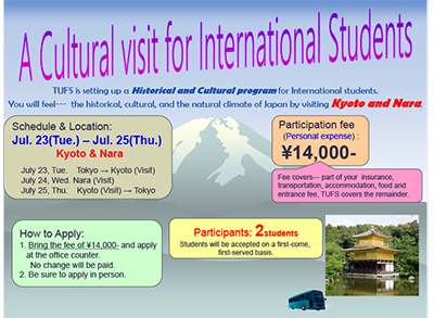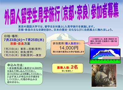 外国人留学生見学旅行(京都・奈良)参加者追加募集 2019.06.21 外国人留学生見学旅行(京都・奈良)の参加者を2名追加募集します。参加希望の方は参加費用を持って留学生課窓口までお越しください。※定員に達し次第締め切りますのでご了承ください。