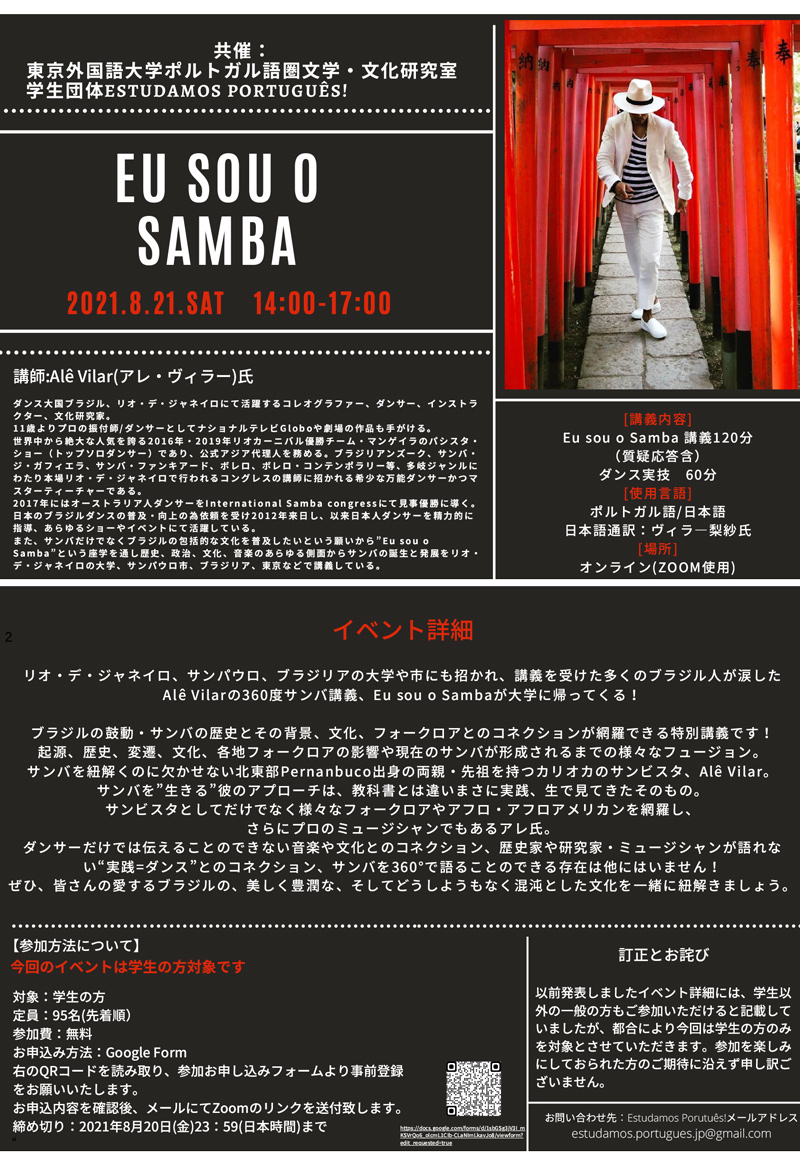 【イベントのお知らせ】講演&実技「EU SOU O SAMBA」 2021.07.29 日時 2021.8.21.SAT 14:00-17:00 会場 オンライン(ZOOM使用) 備考 対象:学生 参加費:無料 事前申し込みが必要 共催 東京外国語大学ポルトガル語圏文学・文化研究室学生団体ESTUDAMOS PORTUGUÊS!