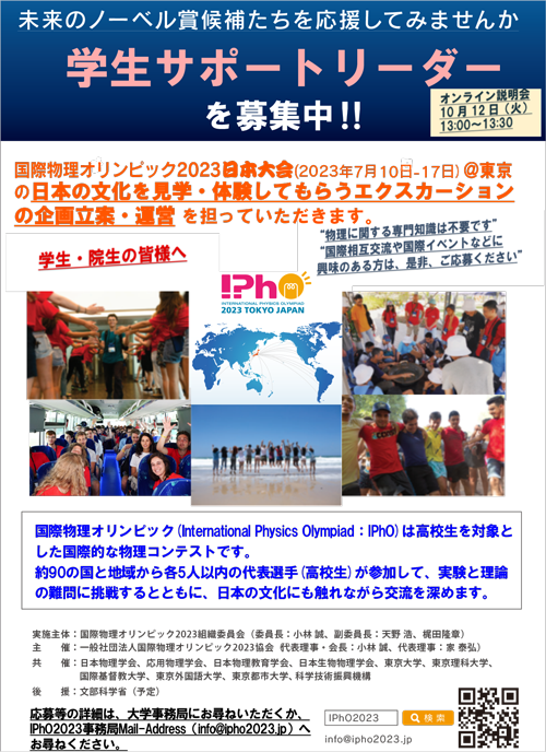 国際物理オリンピック(IPhO)2023日本大会における学生サポートリーダーの募集がありました。