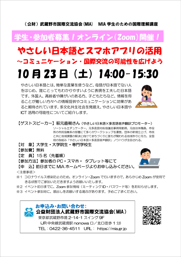 武蔵野市国際交流協会(MIA)からのお知らせ:国際理解講座の参加者募集 2021.10.19 武蔵野市国際交流協会(MIA)から、MIA学生のための国際理解講座(オンラインZOOM開催)の参加者募集 案内が参りました。 詳細はこちらをご覧ください。