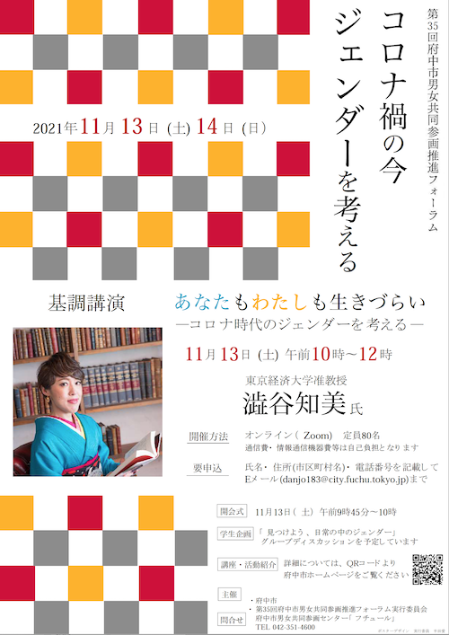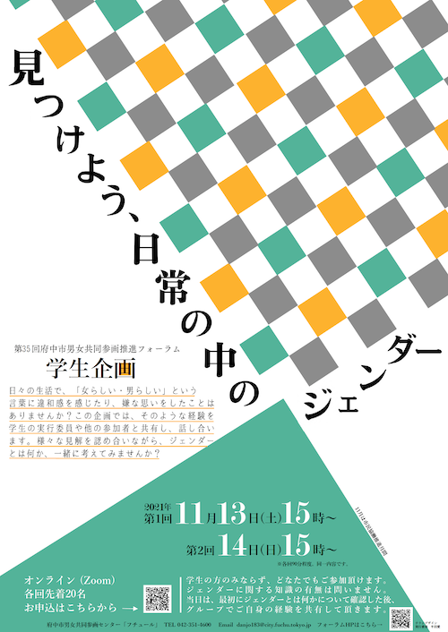 第35回府中市男女共同参画推進フォーラム「みつけよう、日常の中のジェンダー」のお知らせ 2021.10.22 府中市男女共同参画センター「フチュール」より、第35回府中市男女共同参画推進フォーラム「みつけよう、日常の中のジェンダー」のお知らせがありましたのでお知らせします。