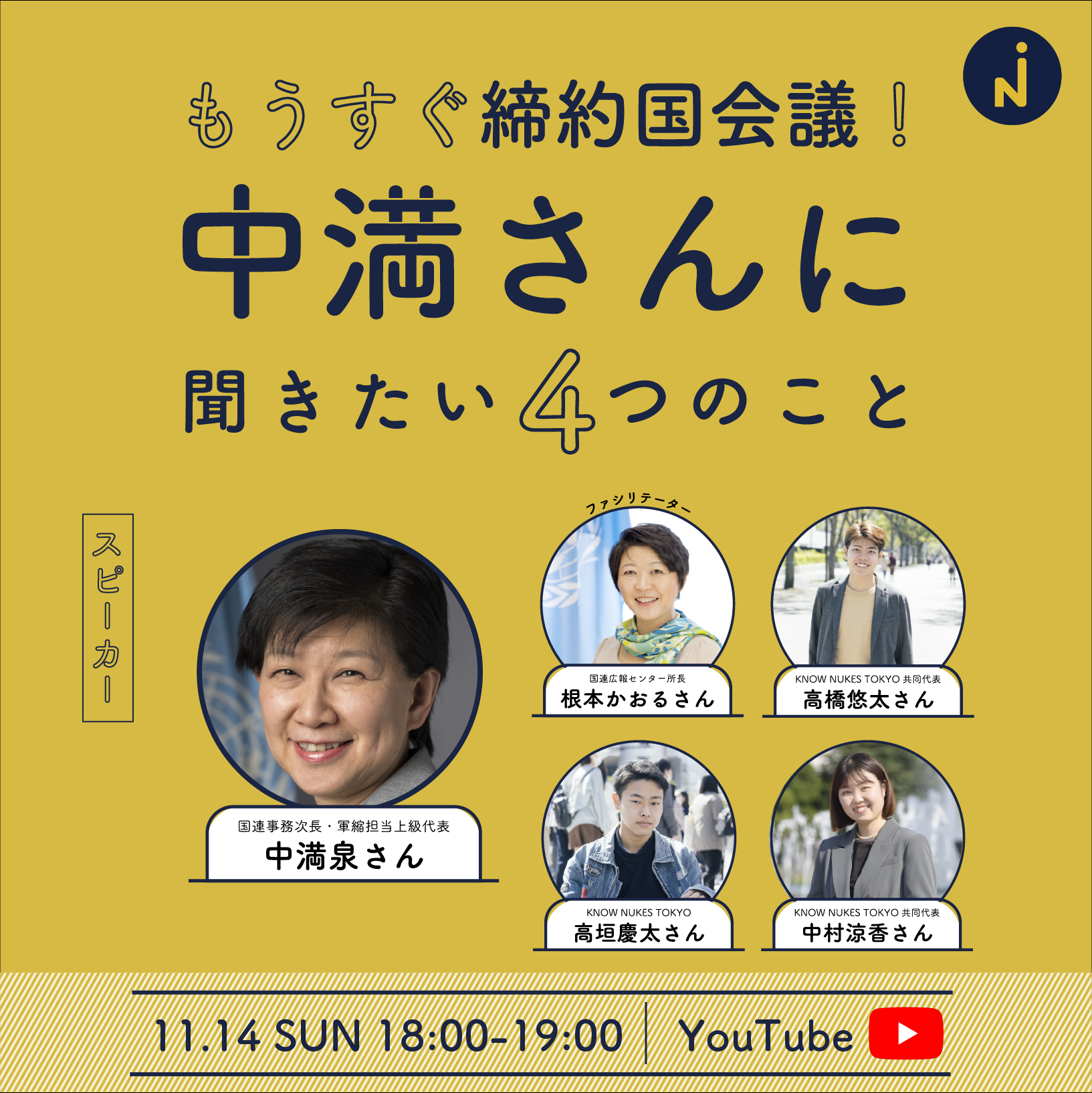 11月14日(日)夕方6時より、中満泉 国連事務次長・軍縮担当上級代表が、KNOW NUKES TOKYO主催・国連広報センター協力のオンラインイベントに参加し、「締約国会議」「国際社会」「世界から見た日本」「日本の役割」をキーワードに、同団体で活動する高橋悠太さん(慶応義塾大学3年)、中村涼香さん(上智大学3年)、高垣慶太さん(早稲田大学1年)と話します。ファシリテーターは、根本かおる国連広報センター所長が務めます。