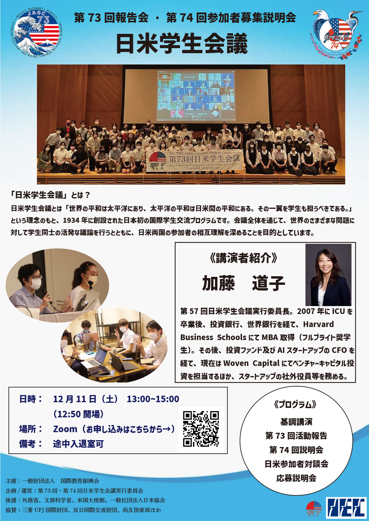 日米学生会議(Japan-America Student Conference)は1934年に発足し、80年余りの歴史をもつ、日本最古の学生交流プログラムです。日本、アメリカからそれぞれ28名の大学生が選ばれ、3週間の本会議が開催されます。今回は、今年度行われた第73回日米学生会議の報告と第74回日米学生会議についての説明会をオンライン行います。社会で活躍する先輩の基調講演や参加者によるパネルセッションを企画しております。