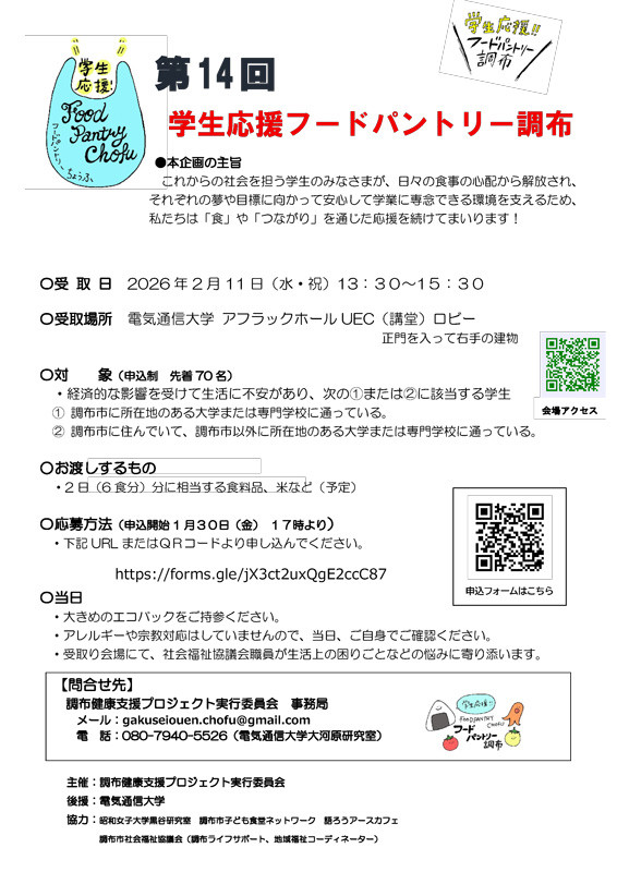 第14回 学生支援フードパントリー調布開催のお知らせ2026.01.29 2月11日(水・祝日)に第14回学生応援フードパントリー調布が開催されます。対象は、調布市在住又は調布市内の大学に在学の学生です。申し込み開始は1月30日(金)17時からです。詳細はこちら↓の添付ファイルをご覧ください。