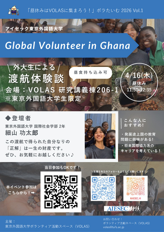 今年度最初となるボラたいむは、本学学生による、ガーナでの6週間にわたるボランティア活動の報告会です。アフリカに興味がある方はもちろん、海外ボランティアを検討している方にもおすすめです。現地でのリアルな体験談や、アイセックのボランティアプログラムについて詳しくお話しいただきます。