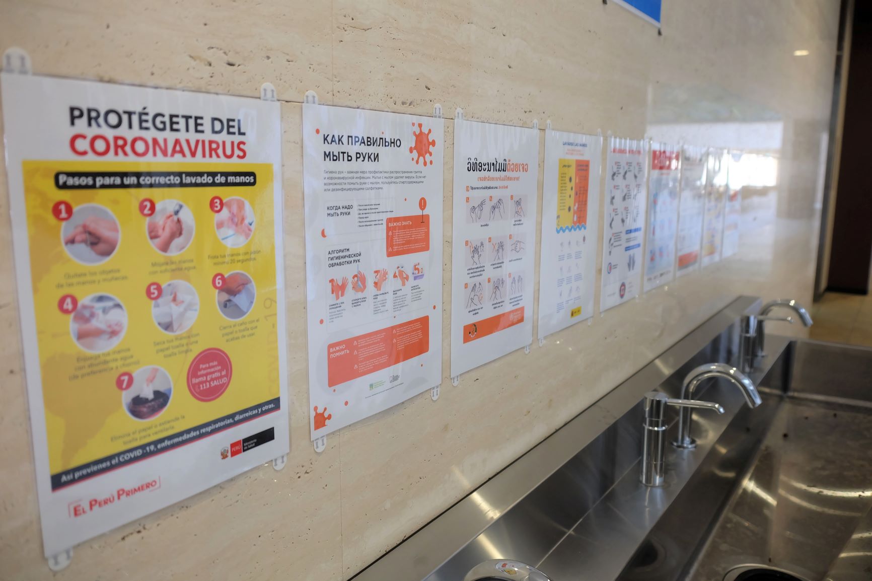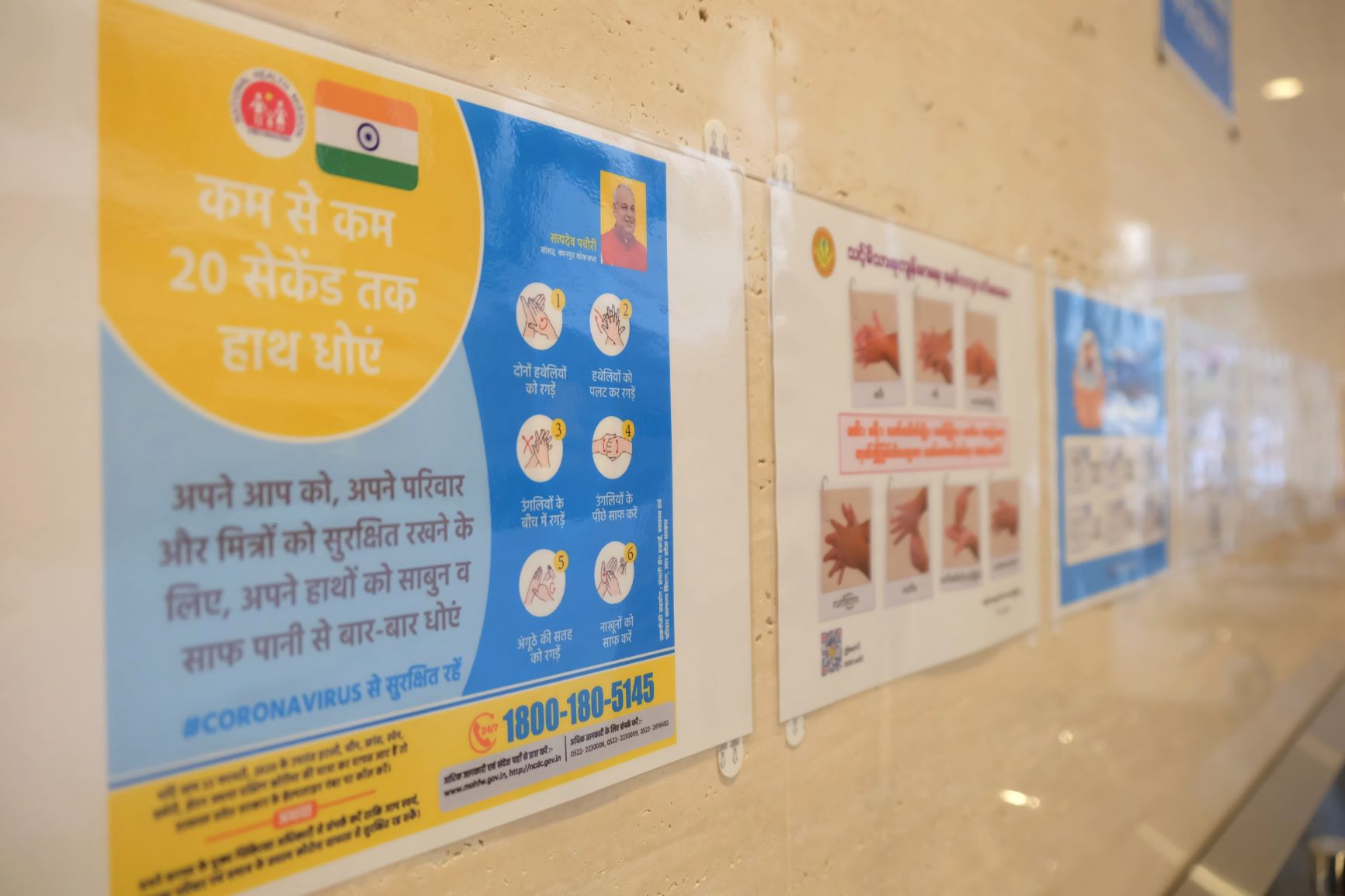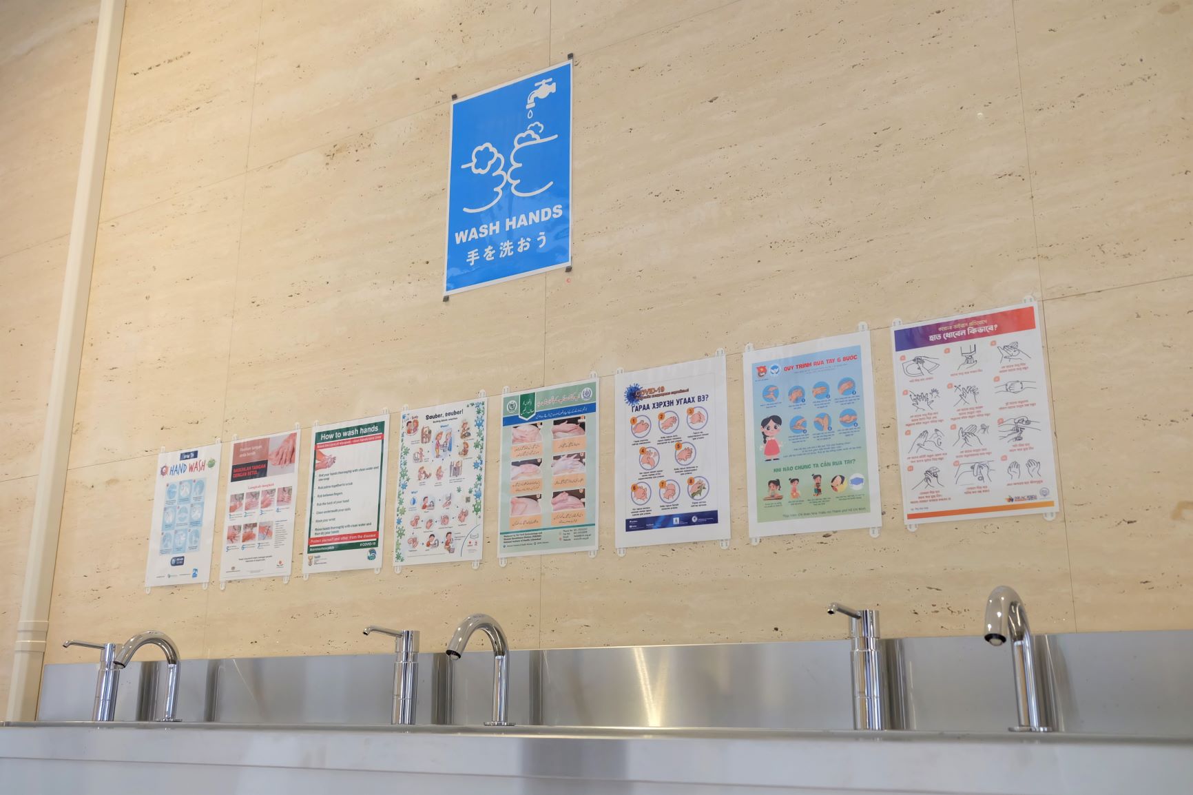 手を洗いながら言語学習もできるよう、各手洗い台前に、28言語の手洗い解説も掲示しました。