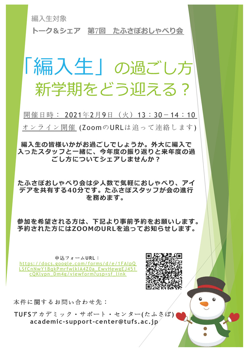 第7回 たふさぽおしゃべり会「テーマ:『編入生の過ごし方』」のご案内