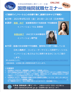 4月23日(金)20:00〜21:15(日本時間)、外務省国際機関人事センター主催のキャリアセミナー<「国連でイノベーションの分野で働く」国連でのキャリア構築>が開催されます。国連の安全保障や平和構築、開発等の分野で活動している日本人職員から、コンピューターサイエンス技術やソーシャルイノベーションをどのように活用できるかについてお話を伺う貴重な機会です。学生の皆さんに広くご案内のうえ是非参加していただいてください。
