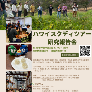 その一環として、東京農工大学と東京外国語大学は2025年9月1日から7日に「ハワイにおける食と農業」をテーマとしたハワイスタディツアーを実施しました。このたびハワイスタディツアー研究報告会を開催しますので、ぜひご参加ください。