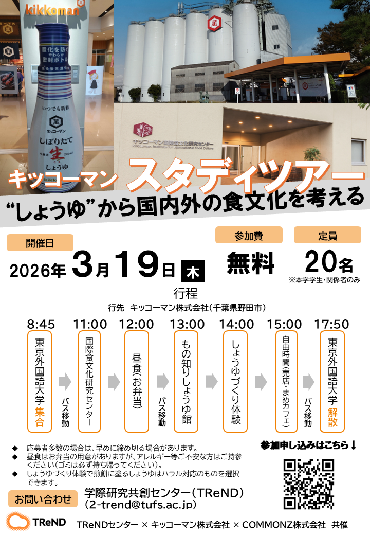 産学連携プロジェクトの一環として、学際研究共創センター(TReNDセンター)では、キッコーマン国際食文化研究センターおよびキッコーマンもの知りしょうゆ館(千葉県野田市)を訪問するスタディーツアーを開催します。
