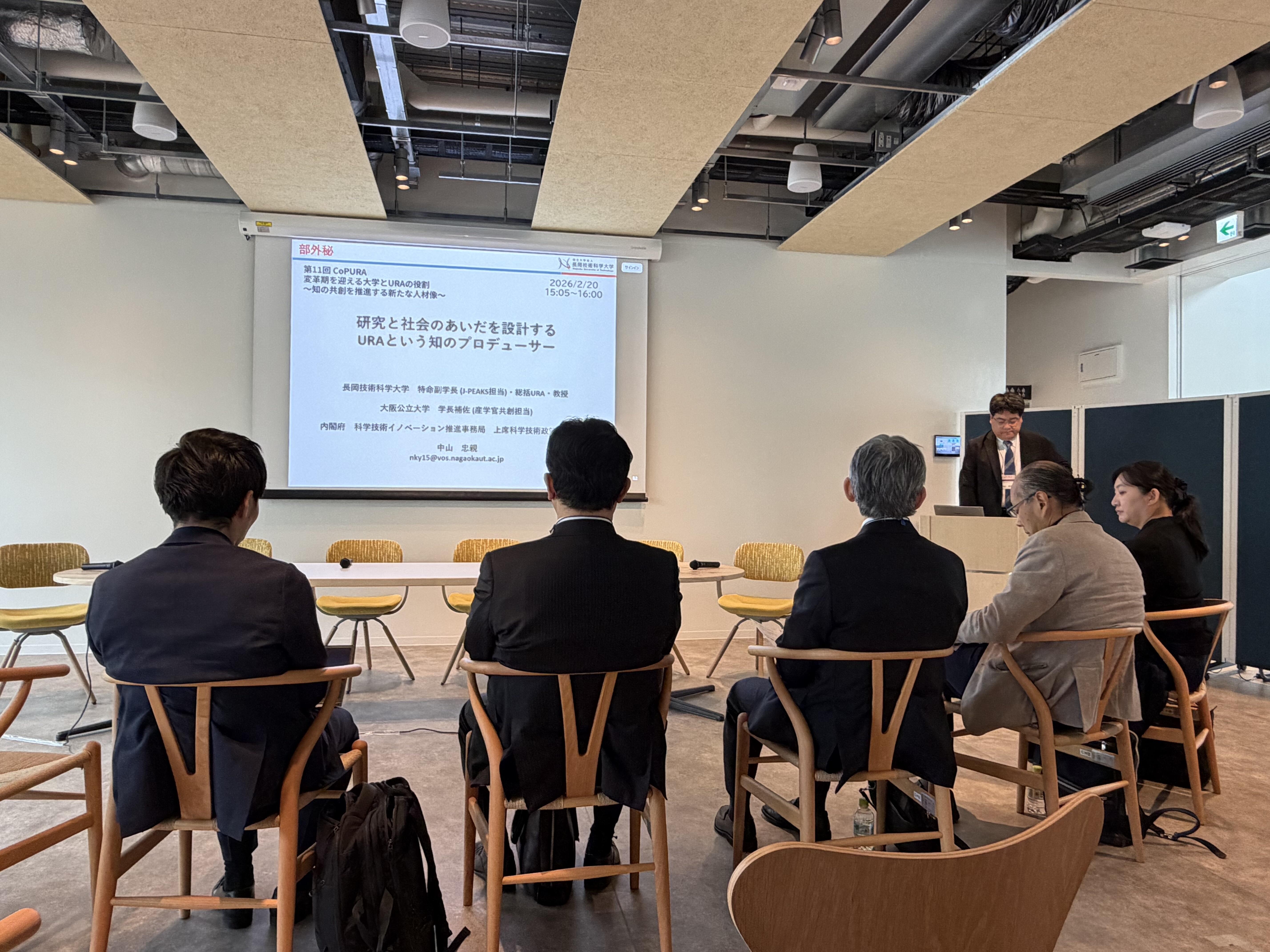 基調講演では、長岡技術科学大学 特命副学長(J-PEAKS担当)・総括URAであり、内閣府科学技術イノベーション推進事務局 上席科学技術政策フェローでもある中山忠親氏より、「研究と社会のあいだを設計するURAという知のプロデューサー」と題した講演が行われました。