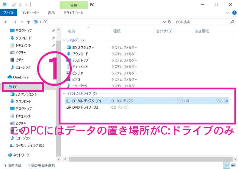 この例では,データの保存ができるのは,C:ドライブだけです.D:ドライブはDVDなので,保存場所としては使えません.
