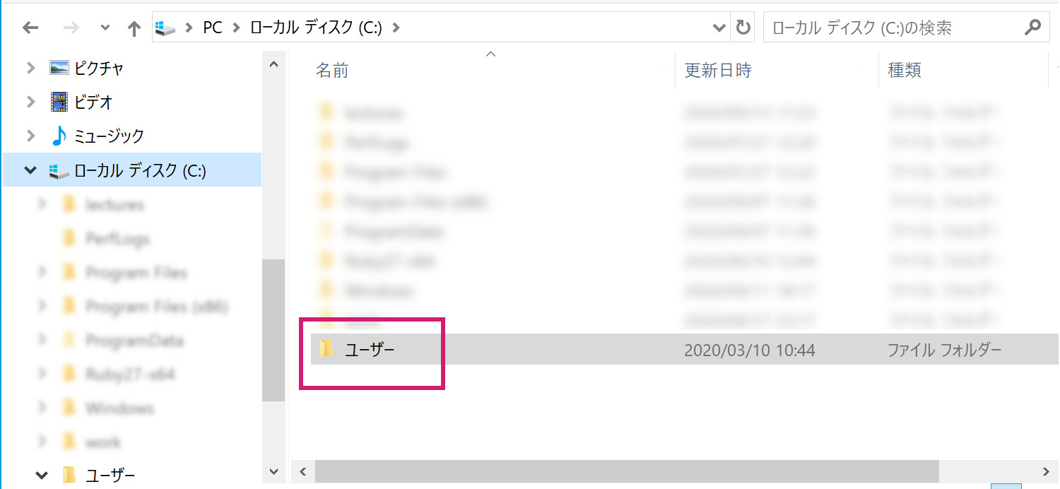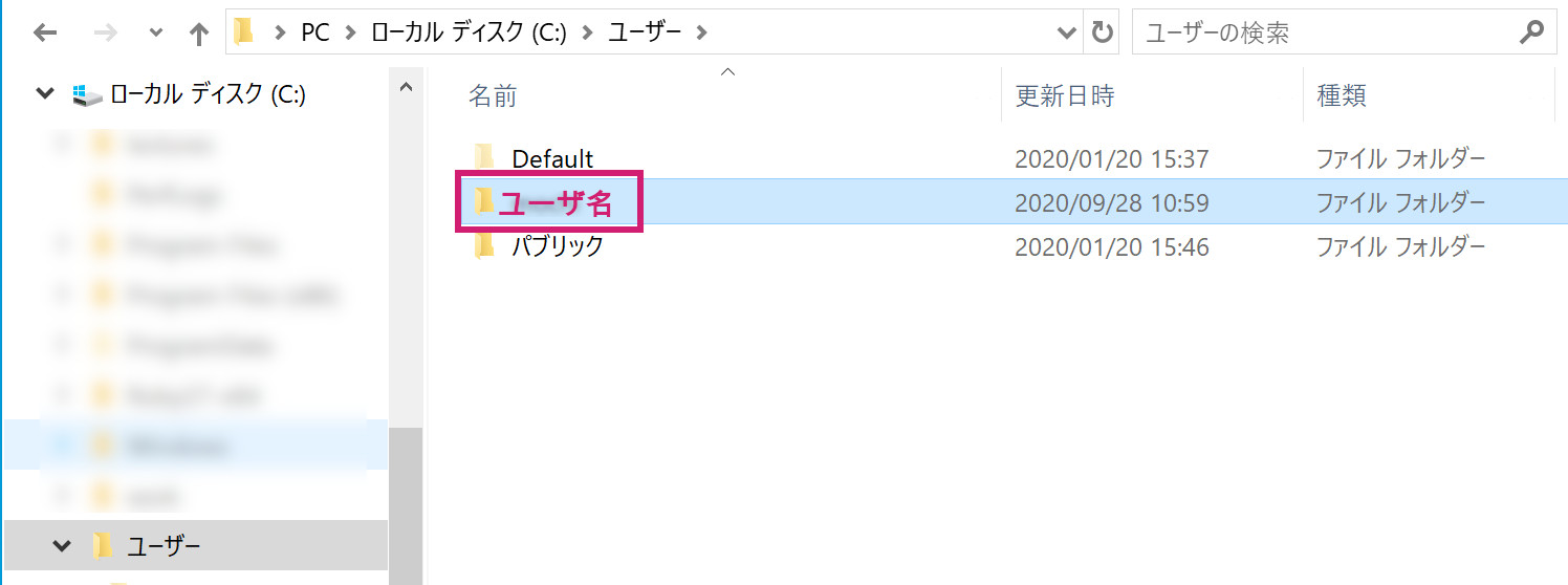 日本語windowsの環境では,C:の中の「ユーザー」フォルダに移動し,