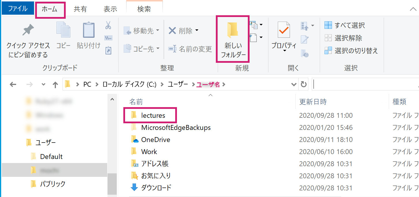 - 「ホーム」をクリックし,「新しいフォルダー」を新規作成し,「lectures」に名前変更をします.