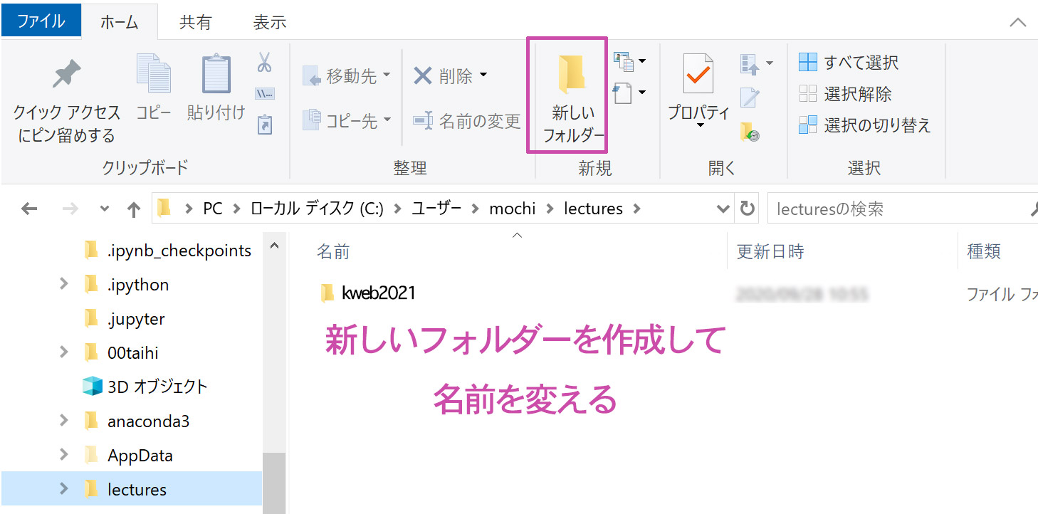 - lecturesフォルダ内に「新しいフォルダー」を新規作成し,「kweb2021」に名前を変えます.