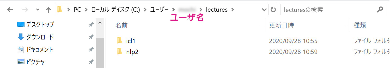 「C:¥Users¥ユーザ名¥lectures¥kweb2021」というパス(path)になります.