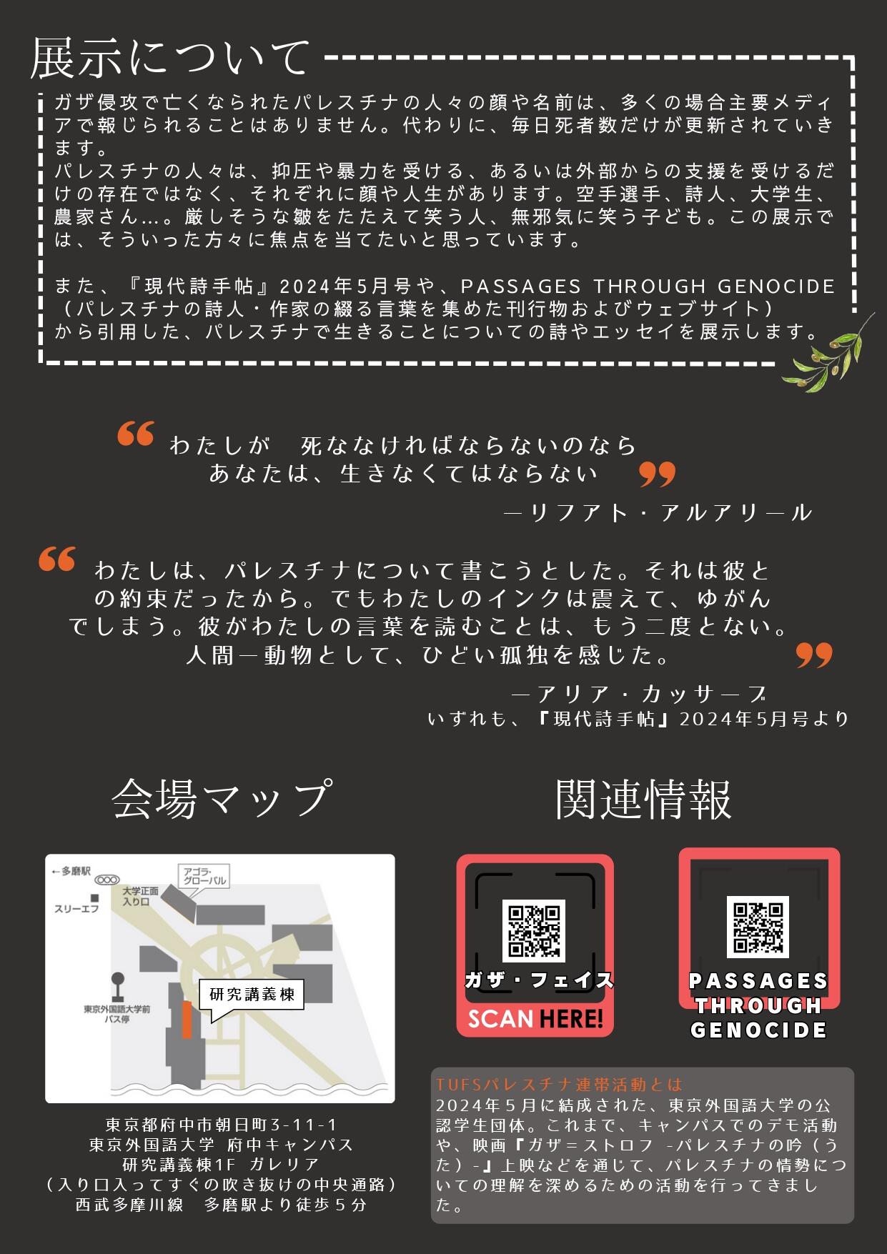 The exhibition will also feature poems by Palestinian poets from the May 2024 issue of "Gendai Shi Techo" and the publication and website "Passages Through Genocide."