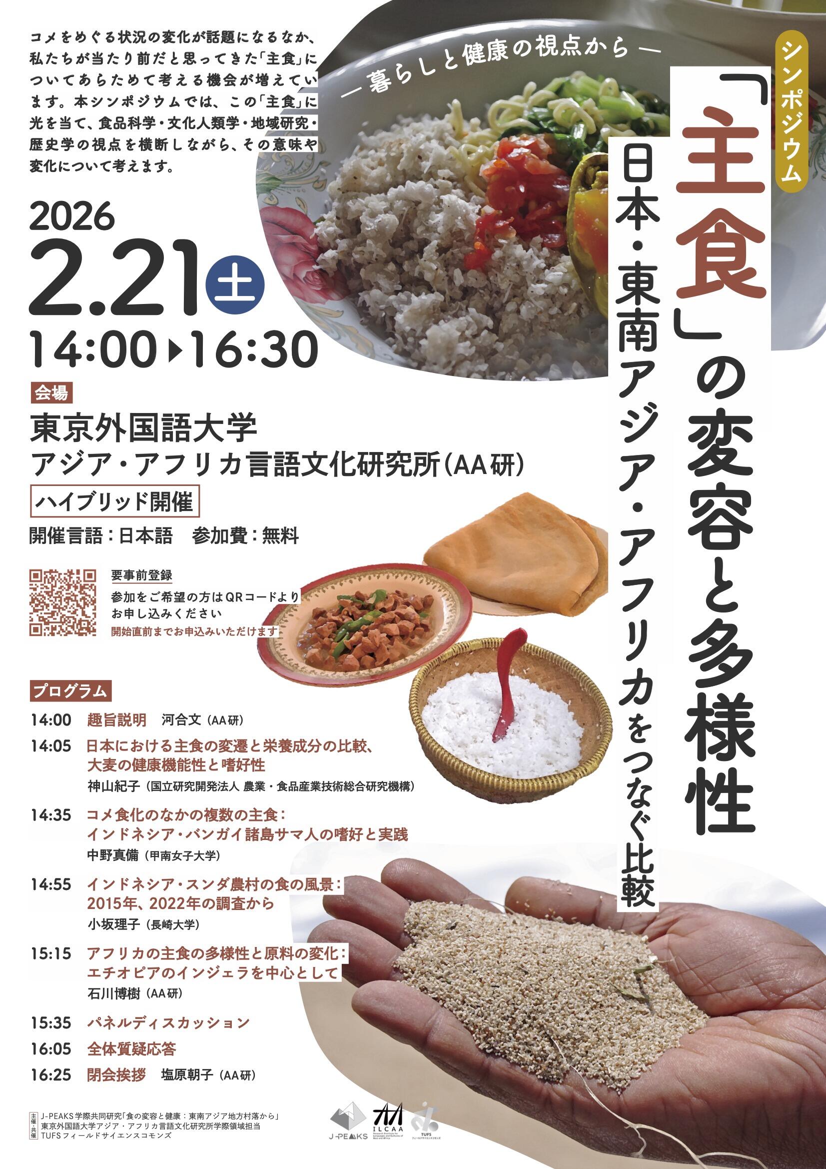As discussions about changes in rice consumption grow, this symposium reconsiders what we take for granted as “staple foods.” Bringing together perspectives from food science, cultural anthropology, area studies, and history, it explores how staple foods have changed and what they mean in different societies. In Japan, the value of grains such as brown rice and barley has been reassessed alongside white rice. In Southeast Asia and Africa, multiple staple foods—including rice, tubers, and sago—coexist, and their forms have shifted over time. Through regional comparison, the symposium asks what defines a staple food and how changes in staples shape everyday life and health. Open to all, it invites reflection on global diversity through everyday meals.