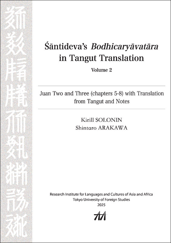 本書は、11-13世紀、中国西方に覇を唱えた西夏国において重要な仏典の一つであった『入菩提行論』の主な残存巻のテキスト、訳注、索引からなる著作である。2025年、東京外国語大学アジア・アフリカ言語文化研究所(以下、AA研)に、日本学術振興会外国人招へい研究者として滞在した、キリル・ソローニン(索羅寧) 博士とAA研教授荒川慎太郎の共編である。 ソローニン博士は2022~2023年まで、AA研に外国人研究員として滞在し、共同研究の成果としてŚāntideva’s Bodhicaryāvatāra in Tangut Translation, Volume 1: First Juan (chapters 1-4) with Introduction, Translation from Tangut and Notes, Research Institute for Languages and Cultures of Asia and Africa 2024を刊行した。本書はその続刊、そして完結巻となる。 本書は『入菩提行論』の5~8巻を扱う。前巻同様、テキスト編、西夏語語彙リスト、サンスクリット語からの対応語彙リスト、西夏文字からの索引、からなる。テキスト編は、当該の原文図版、西夏文テキスト、対応するチベット語・サンスクリット語のローマナイズ、西夏語英訳注、西夏語・サンスクリット語・チベット語の対応、という、工夫を凝らした構成となっている。