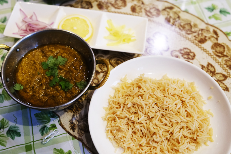 日本のカレーに近いかもしれませんが、パキスタンではこういった料理を「カレー」とは呼びません。何が入っているかで名前が付けられています。これは日本人にも食べやすい味だと思います。お米はバスマティ米という長粒種を使っています。日本米よりもパサパサしていて、水分が少ないのが特徴です。このタイプのお米はチャーハンやピラフに向いています。