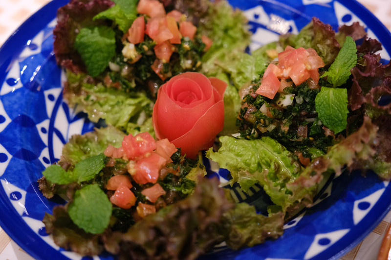 隣にあるサラダも特徴的ですね。小麦の粒が使われていて、ドレッシングはイタリアンドレッシングに近い風味です。食べるときは基本的に手掴みなので、大きな葉っぱなどで巻くようにして食べたりします。