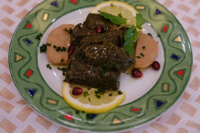 これは「ワラカト・イナブ」というブドウの葉で包んだ料理ですね。中にはお米が詰められていて、酸味のある味付けがされています。中東地域ではよく見られる一品で、特に夏に食べると暑さを和らげる効果があると言われています。