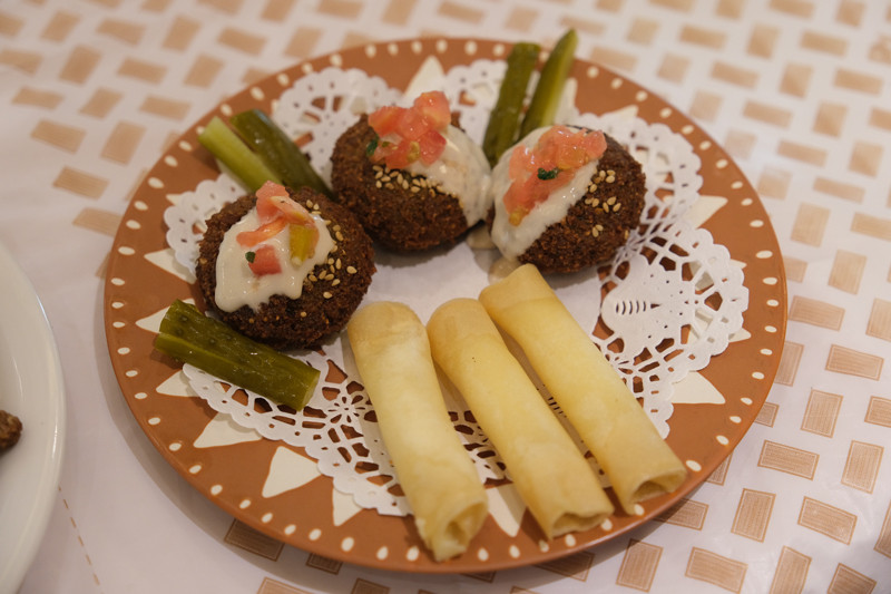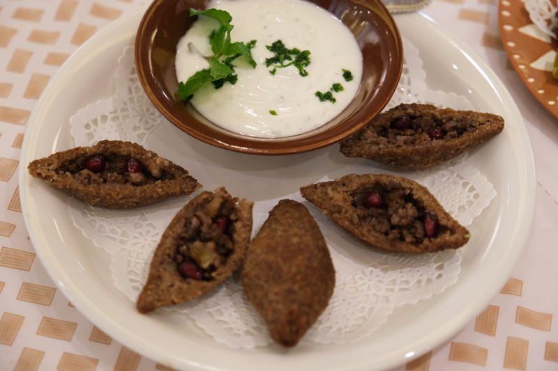 コロッケのような感じで、中に挽肉が入っています。「クッベ」と呼ばれるもので、ドーム型の形をしています。普通は中が見えないように出されますが、今回は中身がわかるように切ってあります。ヨーグルトソースをつけて食べますが、ソースなしでも全然美味しいです。スパイシーで少し酸っぱい味がするのはザクロの風味です。日本でいうとカレーパンのような感じで、サクサクした衣に包まれています。とても美味しいです。これはまだ前菜の段階なんですよ。
