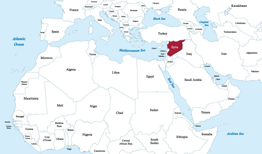 シリアはアジア大陸の西側、地中海に面した国です。北にトルコ、南にヨルダン、サウジアラビアとエジプト、東にイラク、イランが位置しています。国土の広さは日本のおよそ半分ほどで、地理的には「中東」に分類されます。