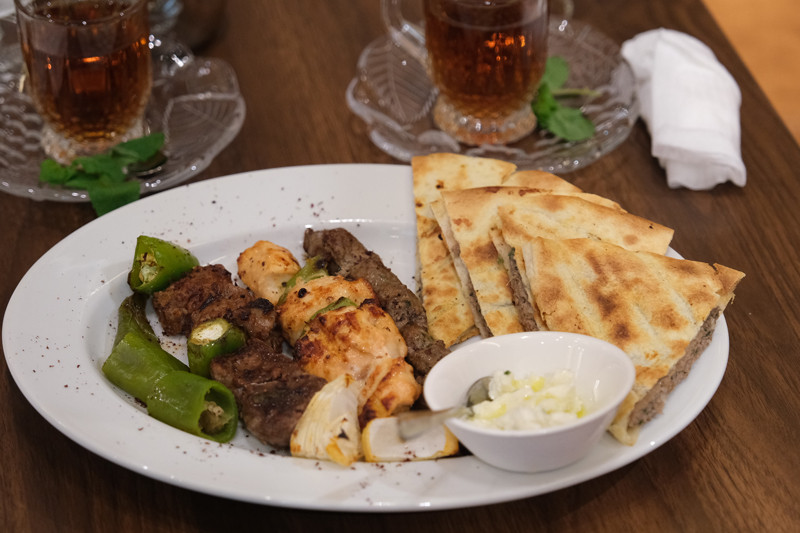 これは、アラブ料理のメインディッシュです。羊のひき肉を使ったカバーブ(シシカバブ)と角切り肉を焼いたシャカフです。チキンとビーフとラムの3種類があります。パンに挟んで食べてみてください。アラブ料理というと辛いイメージがあると思いますが、辛さはゼロです。どうぞ召し上がってください。