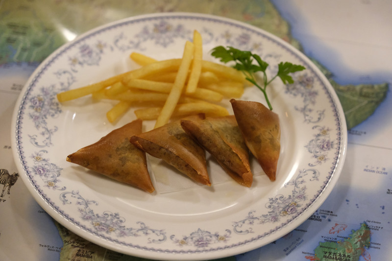 まずこちらの三角形の食べものは「サモサ」と言います。カレー粉で味付けをしたジャガイモなどの具材を小麦粉の皮で包んで揚げたものです。インドでよく食べられているものなのですが、イギリスがインドを植民地にした後、東アフリカも植民地とした結果、インドから多くの人々が東アフリカに移り住み、サモサを持ち込みました。今では、サモサはアフリカ料理の1つとして紹介されることが多くなっています。