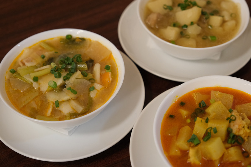 この鶏肉と大根の具だくさんスープは「ラブシャ」といいます。こちらの豚肉・じゃがいも・春雨を煮込んだ具だくさんスープは「ピンシャ」と言います。もう一つは、「テントゥク」といって、小麦粉を捏ねた生地をちぎり入れて煮込んだチベット風のすいとんです。