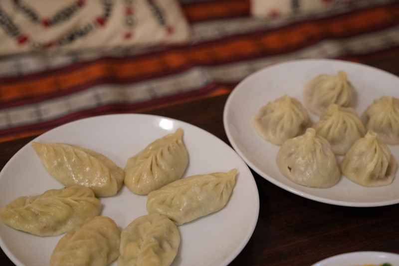 これは、「モモ」といって、蒸しギョウザのようなものです。代表的なチベット料理。丸い方が具材はビーフで、木葉のような形の方が野菜とチーズが入っています。