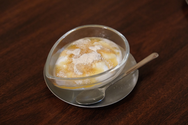 こちらは「ツァンパ・ヨーグルト」です。自家製ヨーグルトにチベット人の主食ツァンパ(麦こがし)をまぶし、オーガニックはちみつをかけたものです。これと一緒に、ハーブティーをどうぞ。チベットは薬草がたくさん生えていて、ハーブを使ったお茶です。